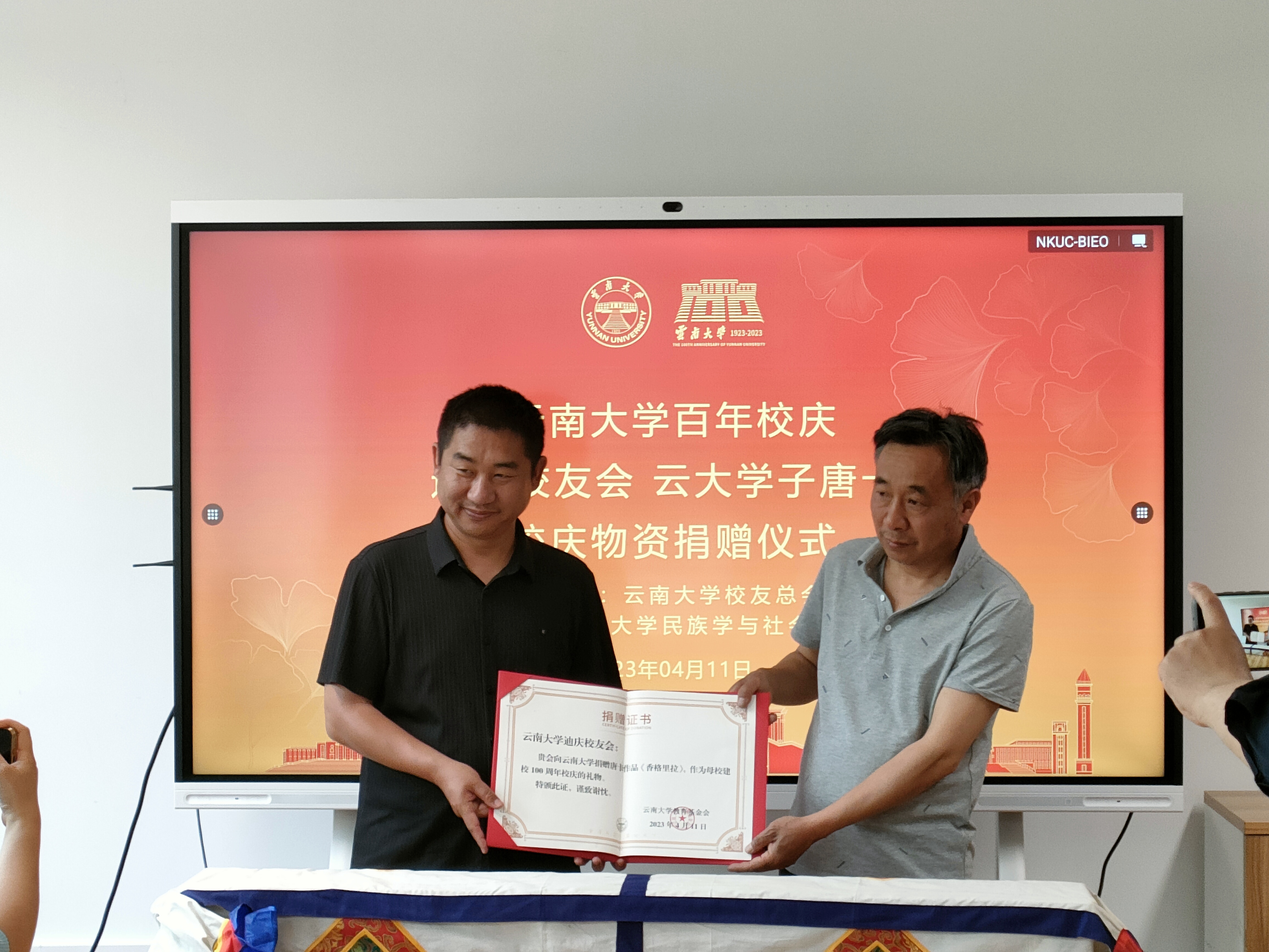 在云南大学建校一百周年即将来临之际,“云南大学迪庆校友会唐卡捐赠仪式”于2023年4月11日在云南大学黄播平台